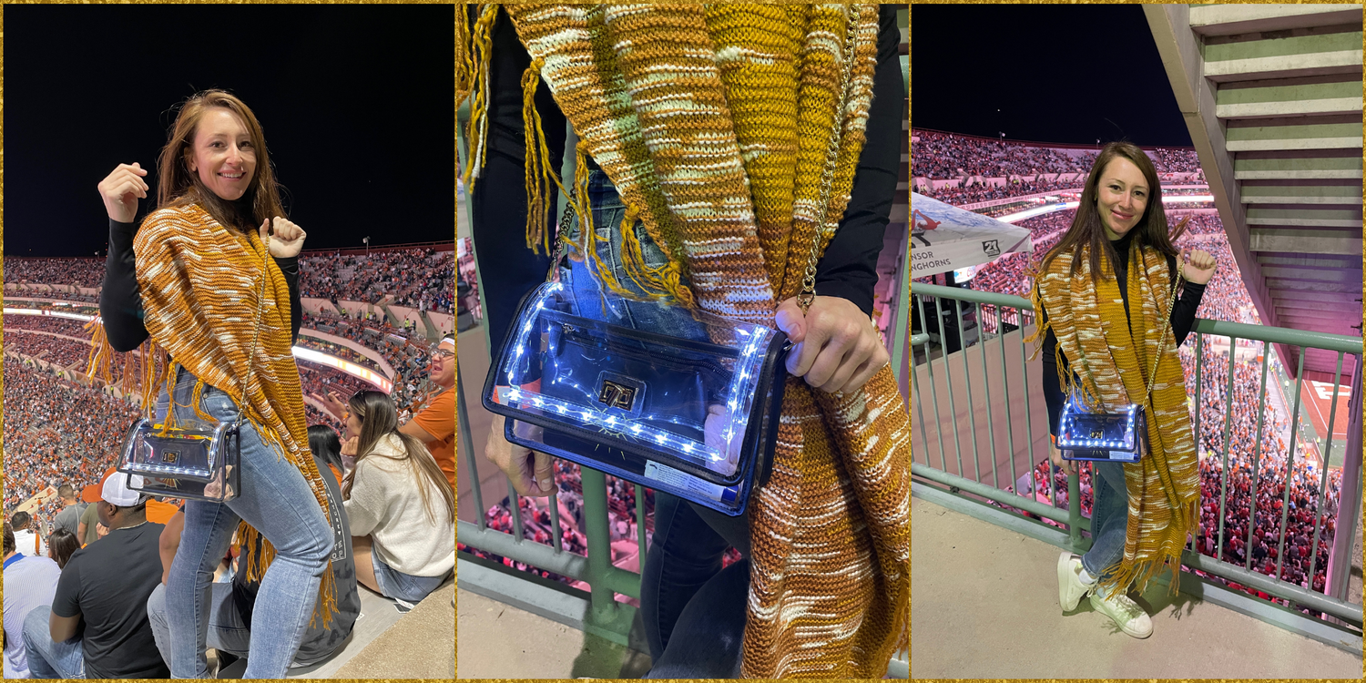 "I got SO MANY compliments on my Glotote! The perfect size and it was easy to find everything I needed in it once the sun went down and it was too dark to see, plus my friends could always find me! Getting into the stadium was a breeze, security especially loved it!"